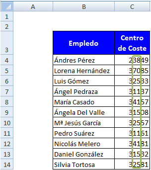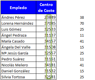 Para el ejemplo anterior como lo que nos interesaban eran las posiciones 2 y 3, la fórmula para el primer centro de coste sería la siguiente: EXTRAE(C4;2;2)